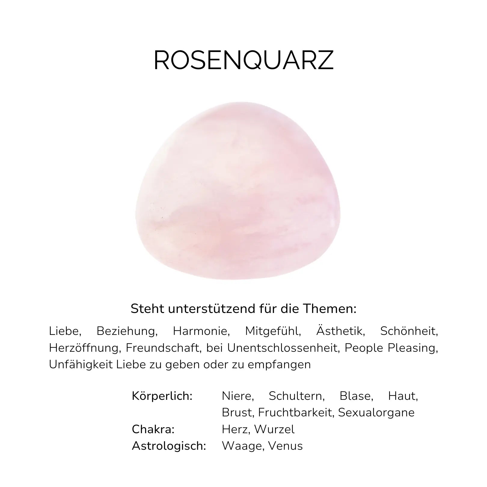 Rosenquarz wird nachgesagt, die harmonisch, mitfühlende und ebenso diplomatische Seite in uns zu aktivieren. Raus aus Unsicherheit und People Pleasing.