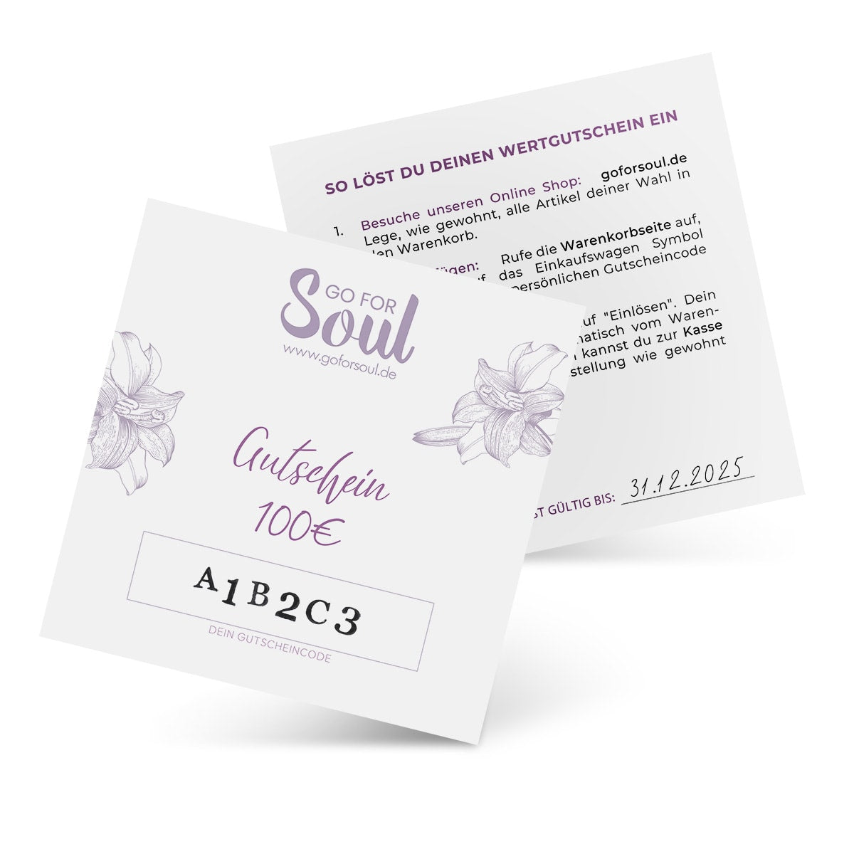 Gedruckte Schmuckkarte mit individuellem Gutscheincode für ein Wertguthaben in Höhe von 30€, 50€ oder 100€.